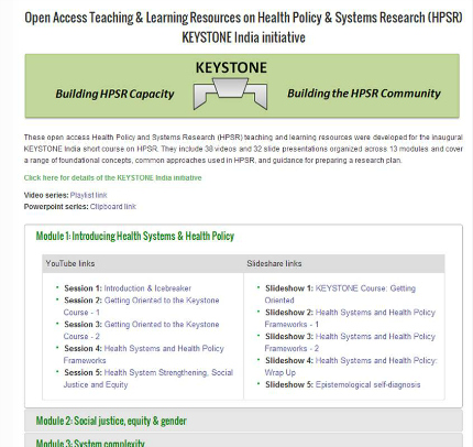 The KEYSTONE India initiative has released a set of open access health policy and systems research teaching and learning resources, originally developed for the inaugural KEYSTONE India short course on HPSR.